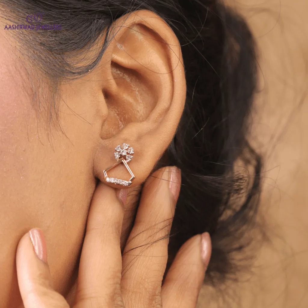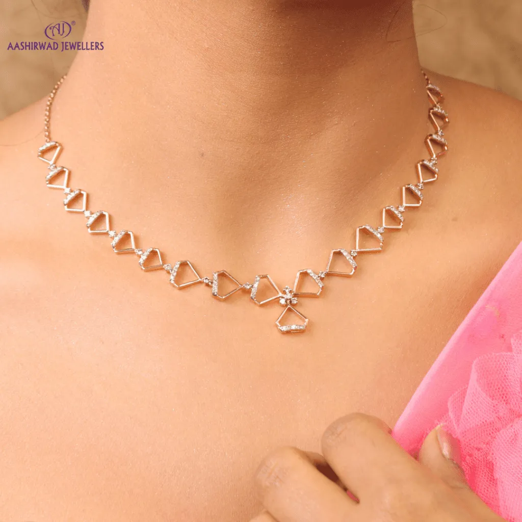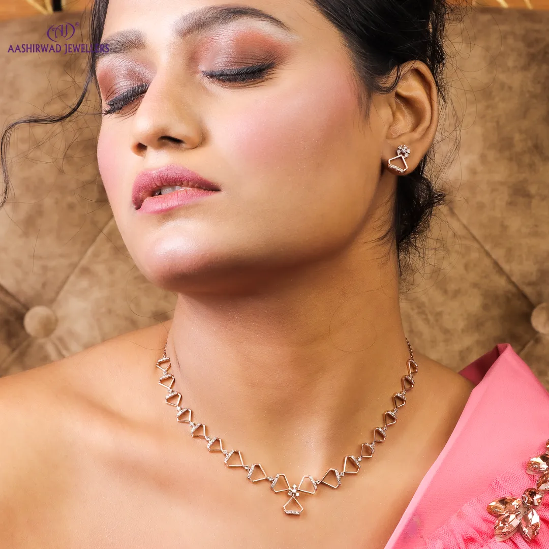 | Illuminate your grace with the timeless allure of Ashirwad Jewelry’s diamond seek necklace. Gold – 14 kt HLMK Earrings Weight– 2.487 gr/.416 ct Necklace Weight– 13.50 gr/ 1.354 ct DiamondColor/clarity– IJ/VS-SI |